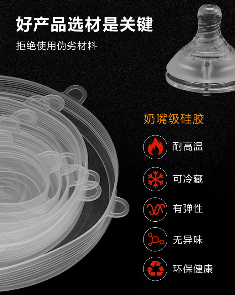 產(chǎn)品特點(diǎn):適用于冰箱冷凍可做保鮮冷藏使用,可進(jìn)洗碗機(jī)消毒柜,也可進(jìn)烤箱、微波爐加熱制作食物。能使鍋碗密封,用于食品保鮮。配合不同大小鍋、碗、盆以及杯子等器皿使用。產(chǎn)品方便清洗,手感柔軟,顏色鮮艷,經(jīng)久耐用,環(huán)保健康。