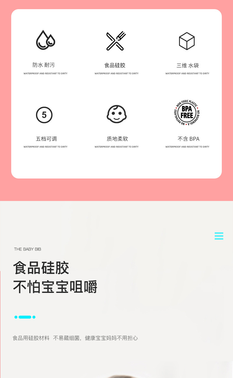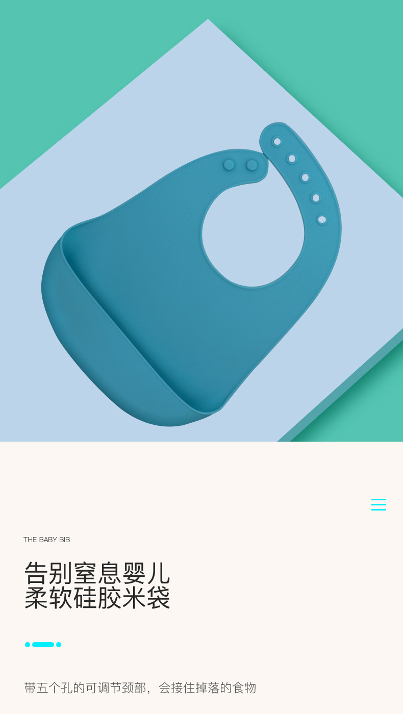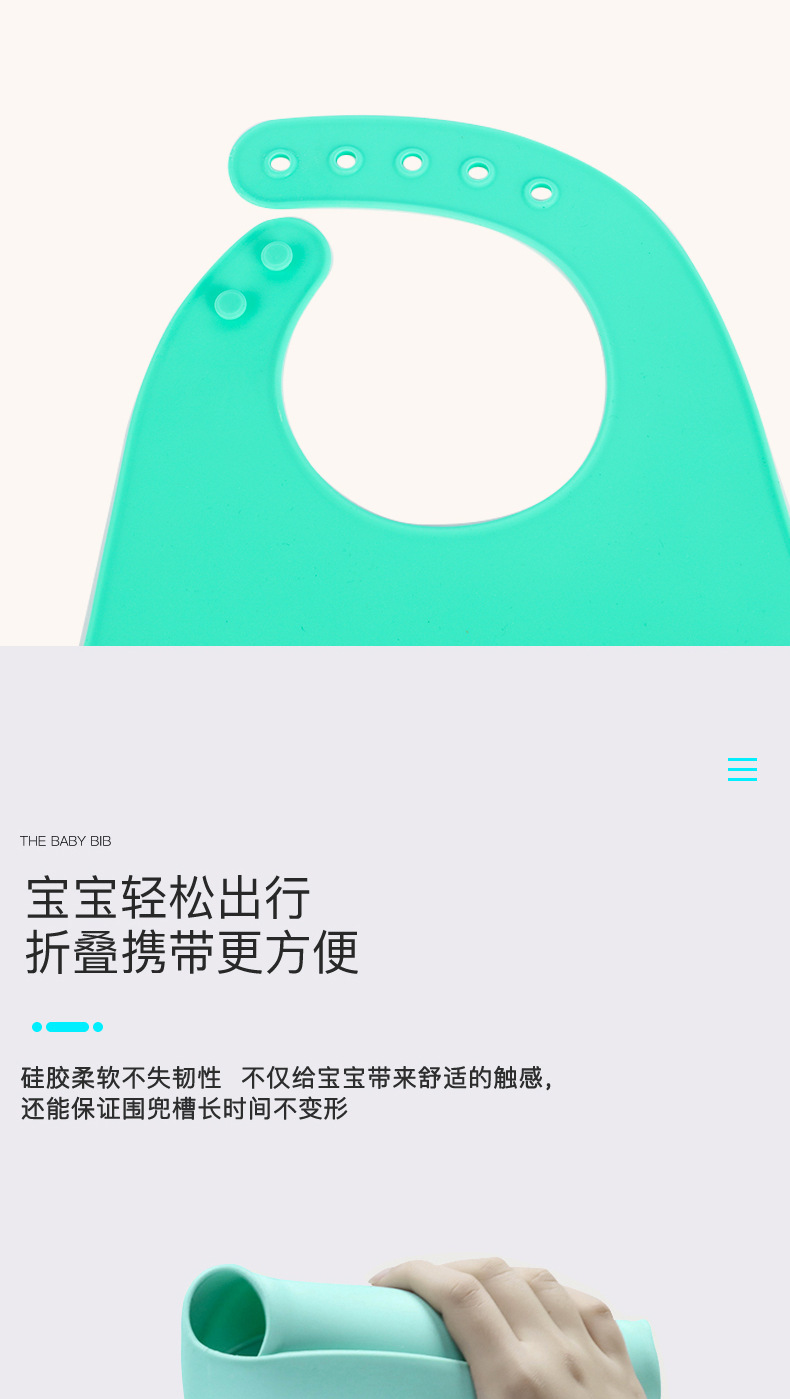 嬰幼兒唾液分泌一直以來每個家庭中都沒有得到很好的解決方法,嬰兒從出生知道一歲多這個時間段里面張嘴口腔動作屬于萌芽期,所以流口水也不是它們的錯,吃飯灑漏更不是他們的錯,所以寶媽們洗衣服也是沒理由的,而目前只能選擇以預防為主,而硅膠圍嘴兜目前是主要的嬰幼兒防護用具,所以看準這幾個因素選對圍兜可輕松很多。