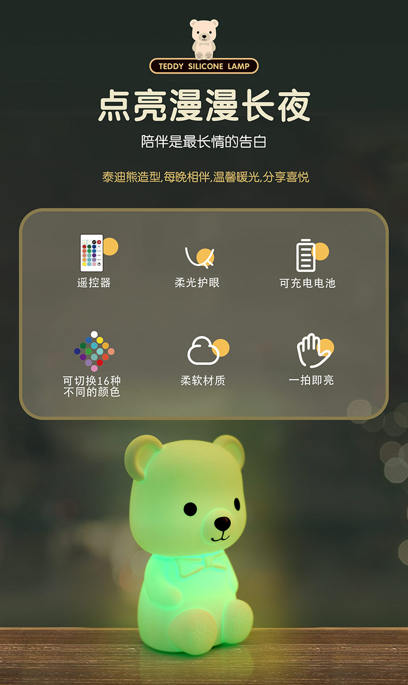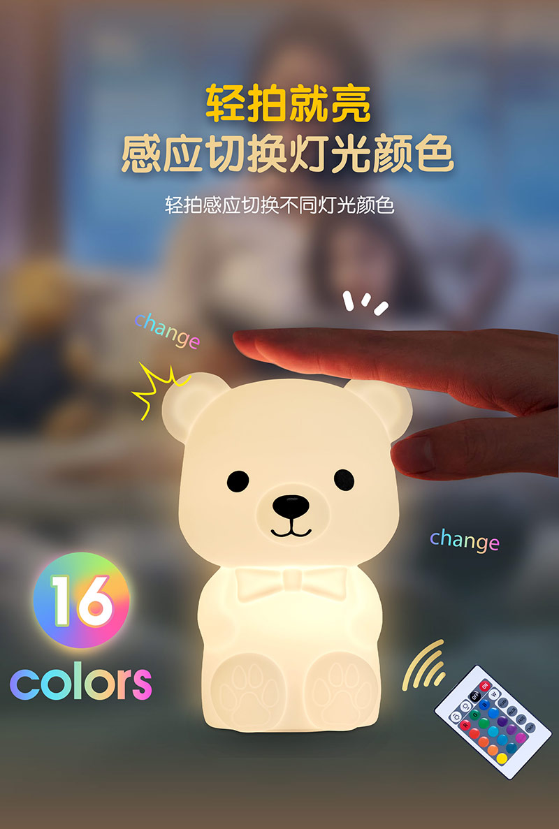 您的位置:首頁 > 產品中心 > 硅膠家居用品 > 拍拍燈 > 泰迪熊硅膠臥室氛圍床頭伴睡小夜燈拍拍燈廠家跨境批發(fā)