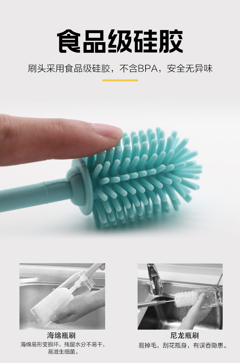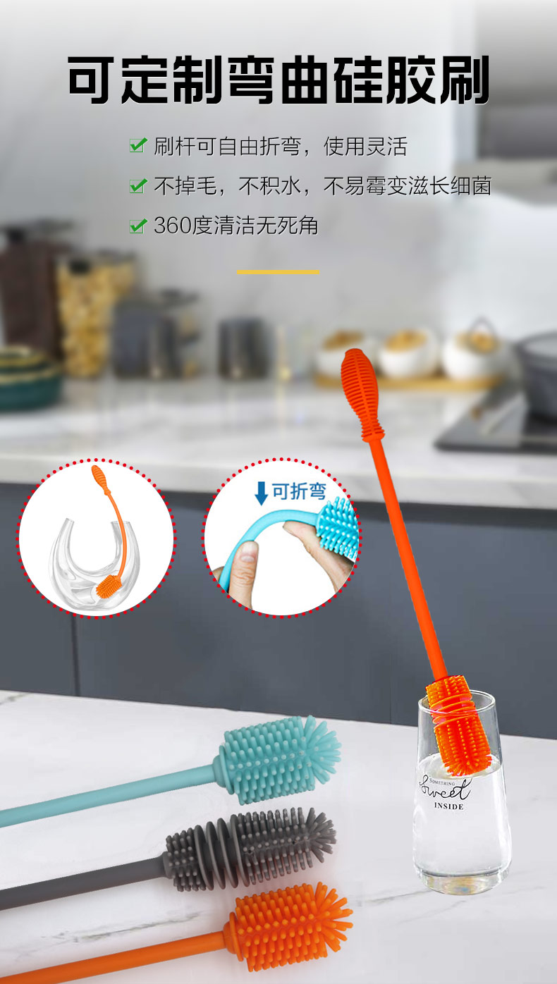 給心愛的杯子配一個硅膠刷,可以360度清潔水杯內(nèi)壁,刷頭采用食品級硅膠,不含BPA,無異味,相比海綿瓶刷不容易變形,不容易殘留水分滋生細(xì)菌。適合各類杯子的清潔??铺├鳛橐患夜枘z制品OEM廠家,有能力也有條件定制可彎頭的硅膠刷,人性化的設(shè)計,易懸掛便利瀝水,節(jié)約空間。